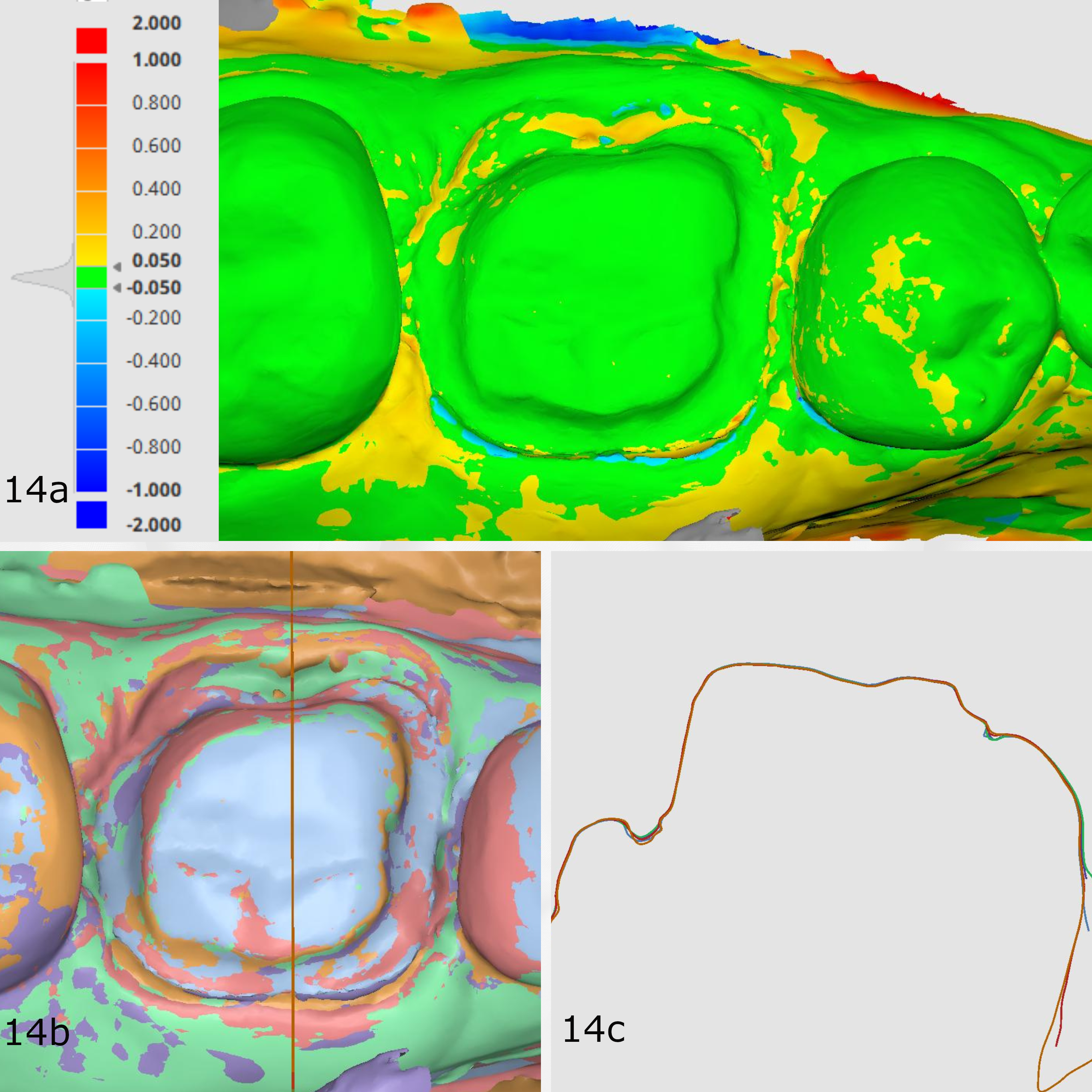 Figs. 14a–c: Deviation map of the scans compared with CEREC Primescan’s scan (a; scale of 50 μm) and sectional view (b & c). Very little deviation around the preparation area.