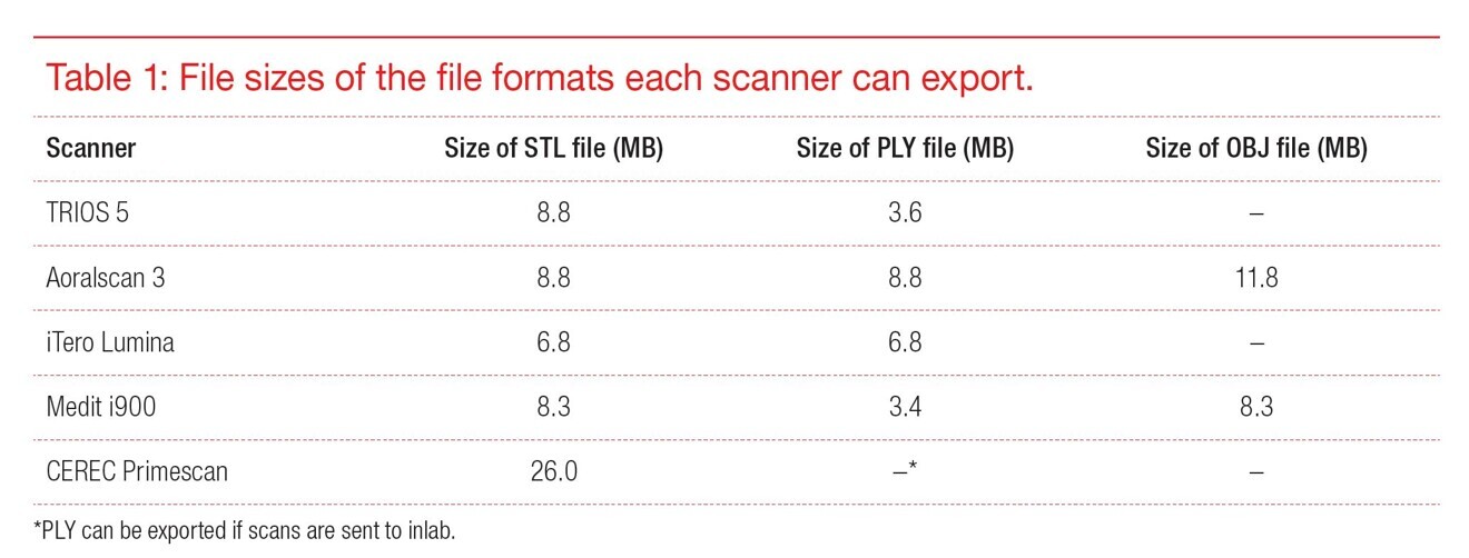 All IOSs have an open architecture that allows scans to be exported and sent to laboratories. These scans are usually exported in three various formats: STL, PLY or OBJ. STL files are exported as monochromatic scans, whereas OBJ and PLY files store colour. Not all IOSs can export OBJ and PLY files, whereas STL files are widely used as a default in the entire industry. This particular set of scanners is capable of exporting scans in these formats: