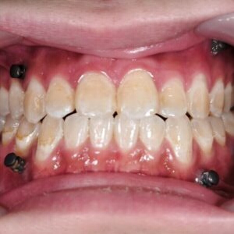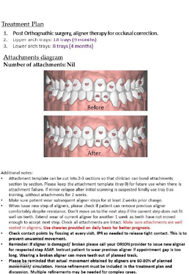 Postoperative Orthodontics: Accelerated tooth movement facilitated occlusal stability utilising Orion Aligners for the final correction of the occlusion. In this case, the use of aligners instead of traditional orthodontic with fix appliance was advantageous as the patient was living overseas and not having the liberty of access to the orthodontist there.