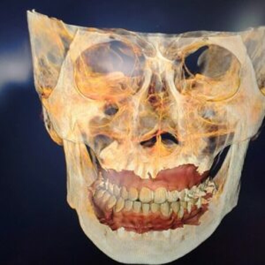 Fig. 1a: This picture shows a full CBCT (Vatec, Korea) and superimposition of the intraoral scan (Shining, China) of the teeth and occlusion. It shows a right occlusal crossbite discrepancy as well as a general skeletal asymmetry.