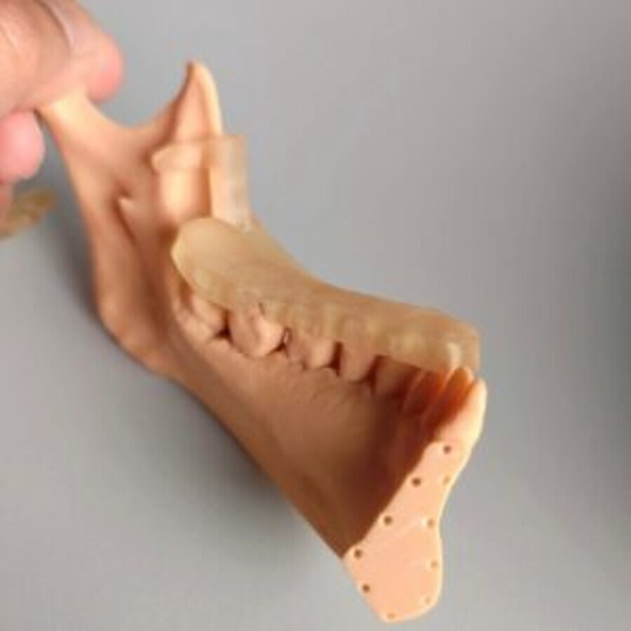 Fig. 3: This is a 3D printed models of the jaw and the actual surgical guide to where the cuts should for a clean sagittal split osteotomy. The surgical guide will lead the cuts and avoid critical surgical structures such as the lingual foramen where the inferior alveolar nerve enters the mandible.